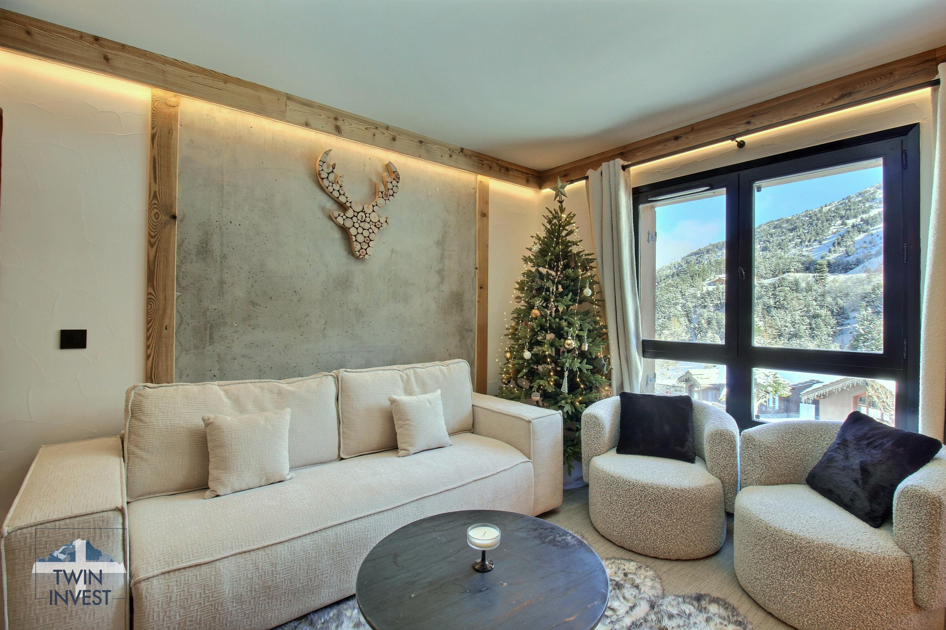 - D'une cuisine équipée, ouverte sur un salon lumineux avec accès à un balcon offrant une vue sur le Mont-Blanc.