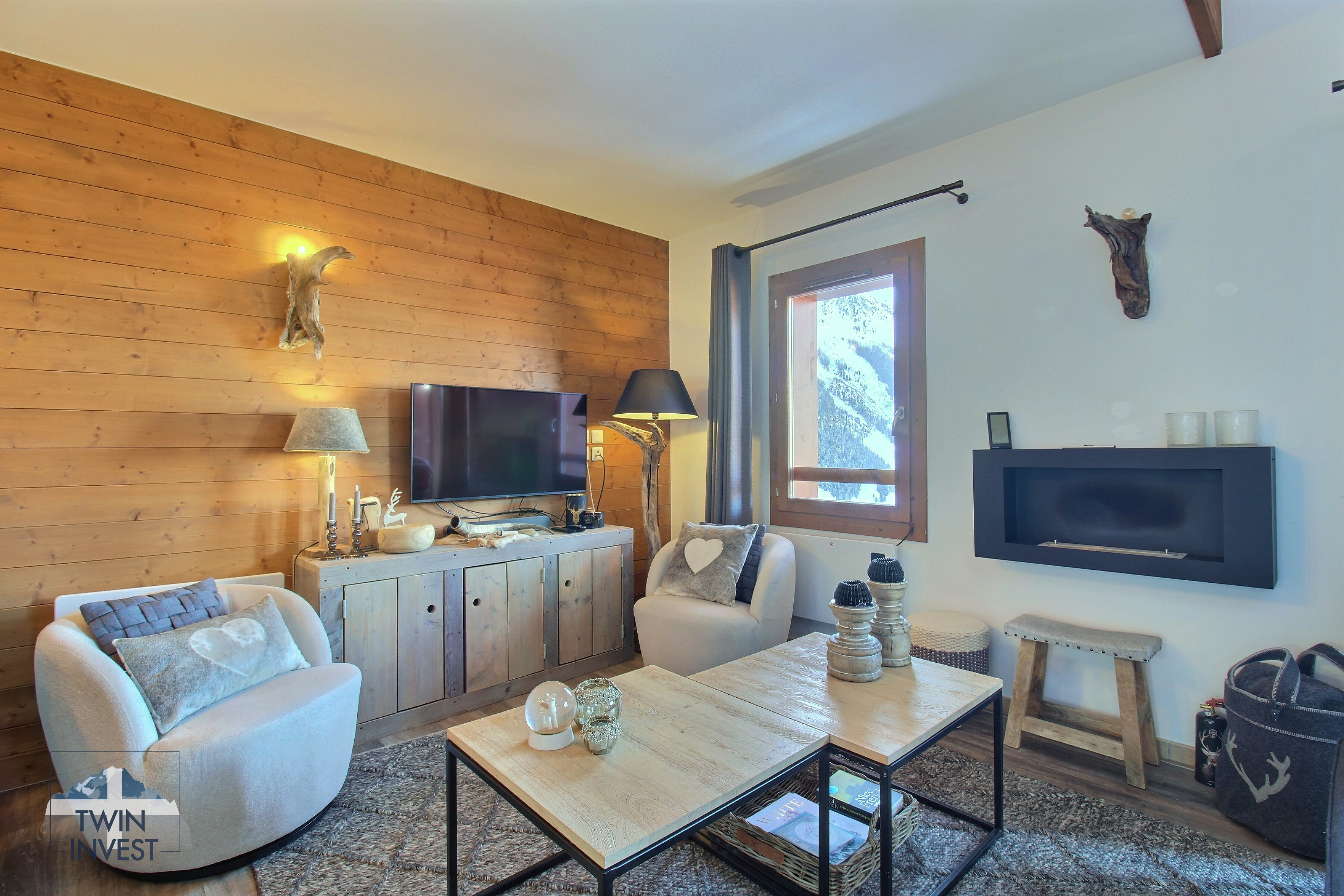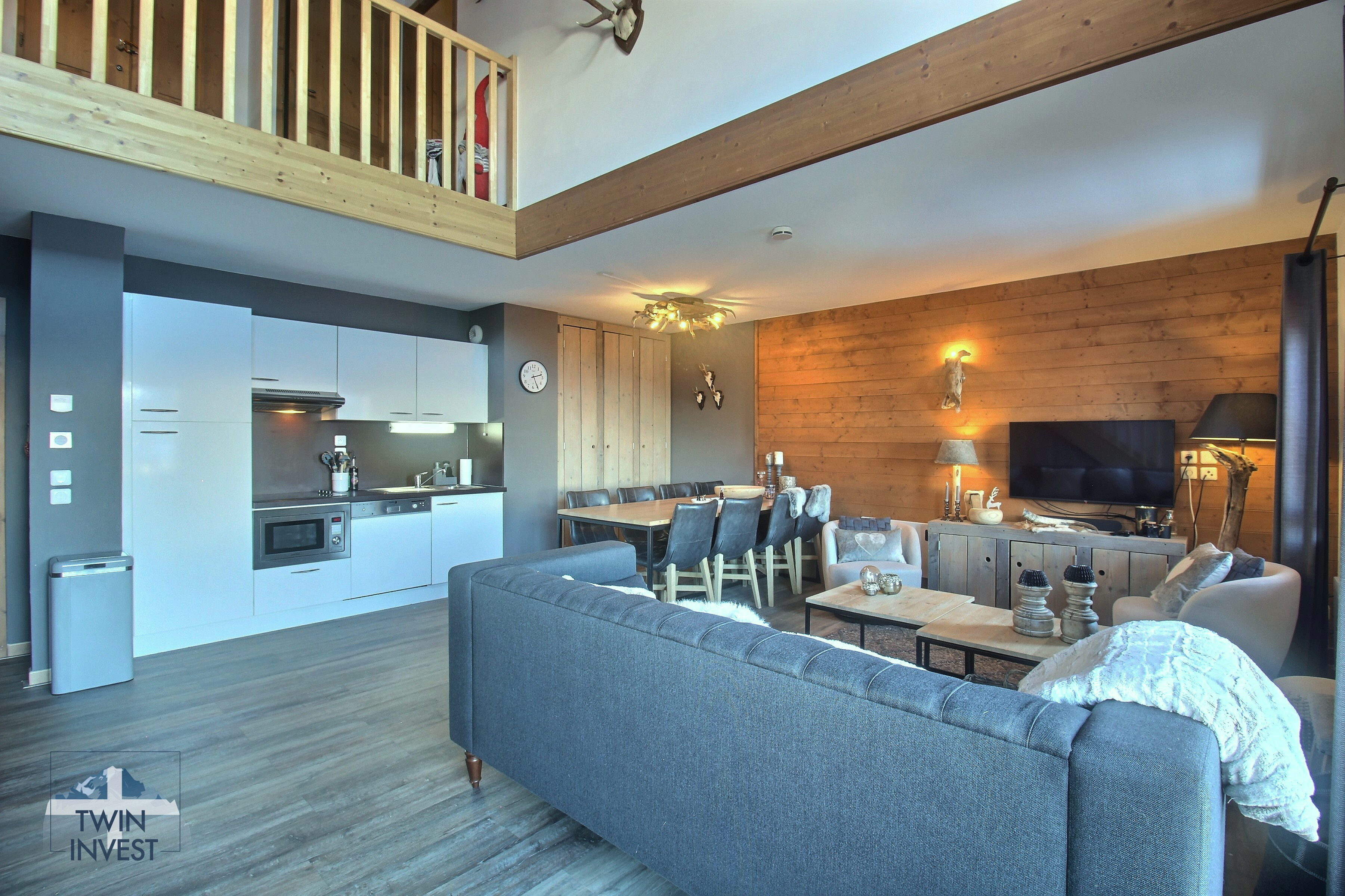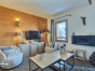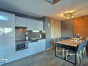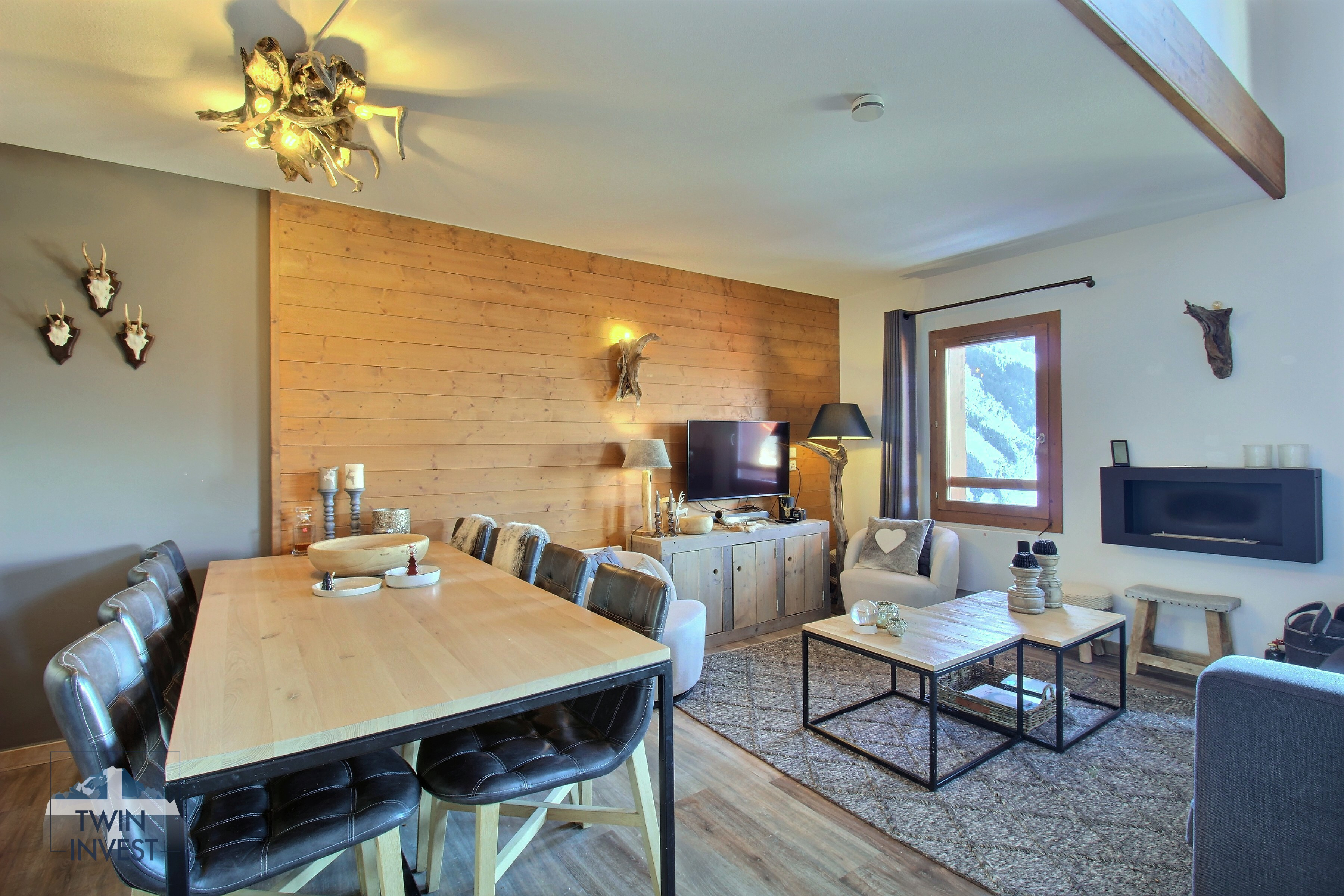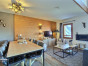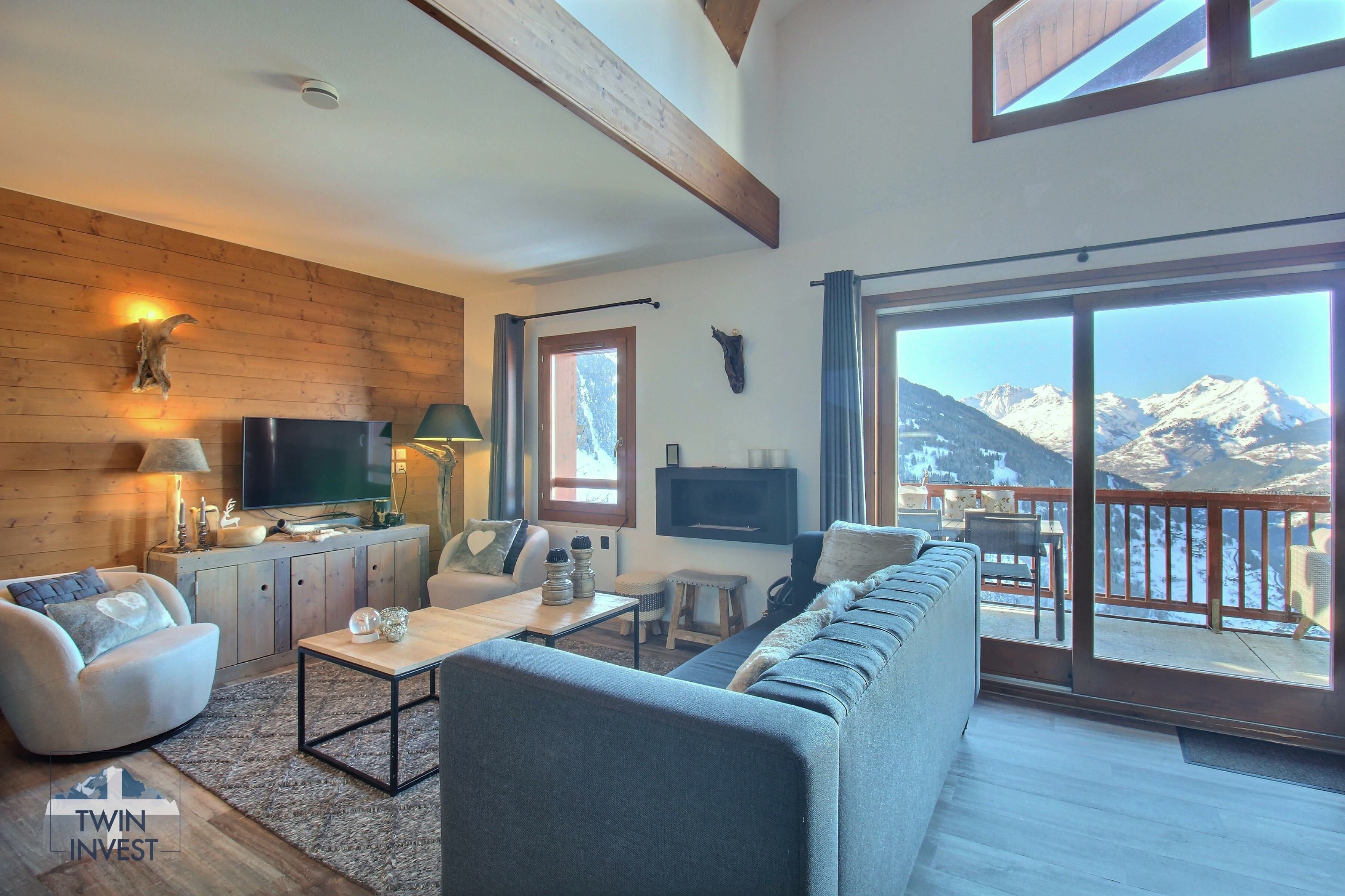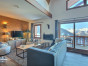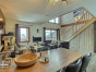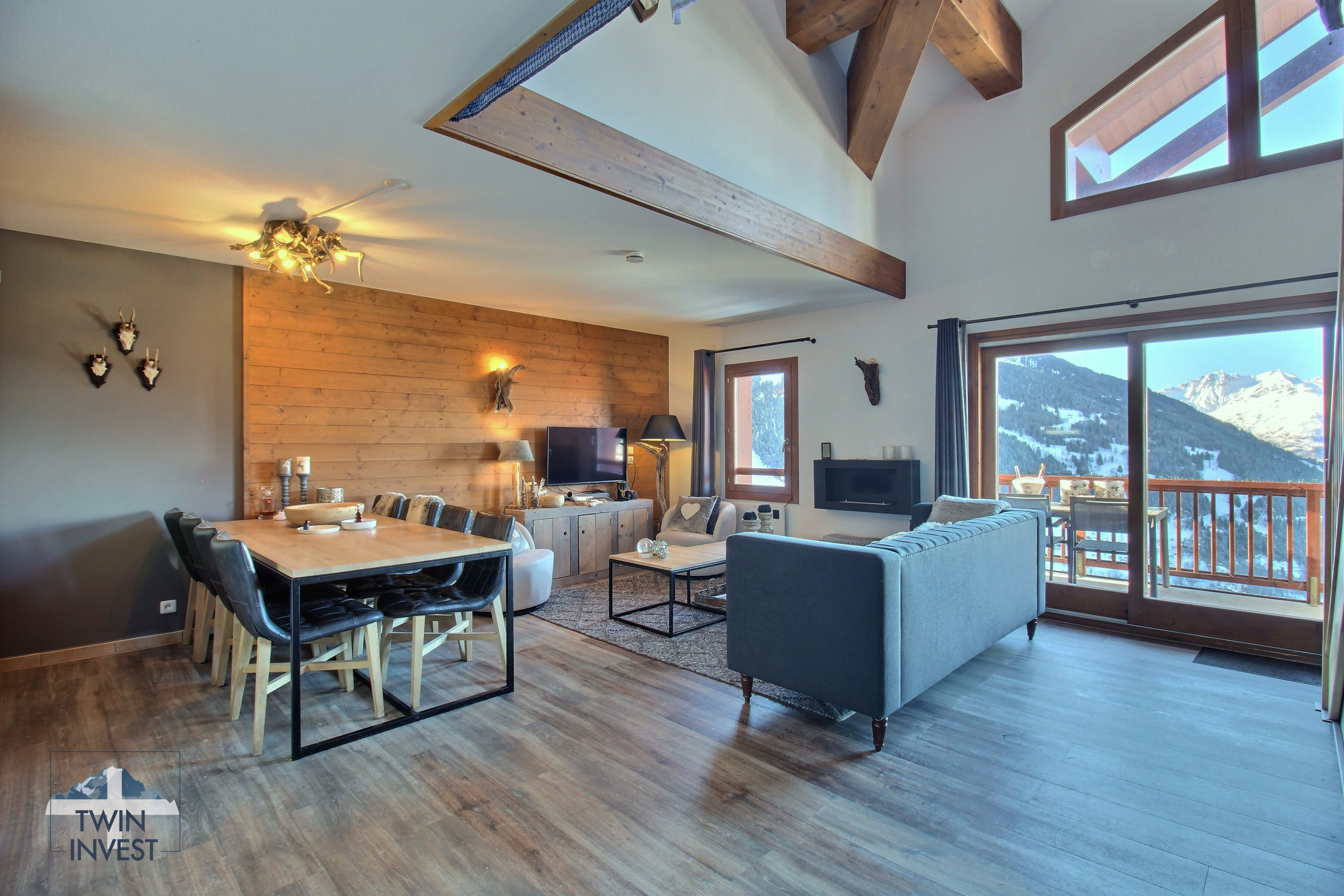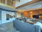 Salon ouvert sur une cuisine entièrement équipée avec de très beaux volumes et une vue panoramique sur les sommets et la vallée de la Haute-Tarentaise.